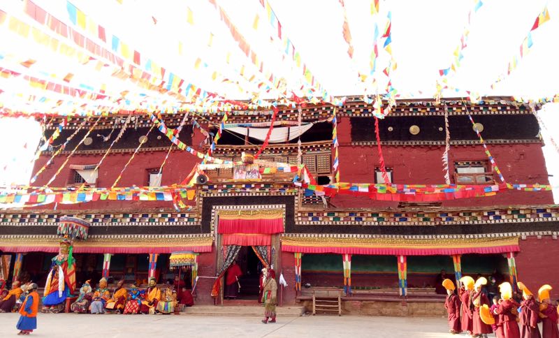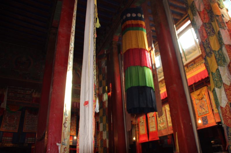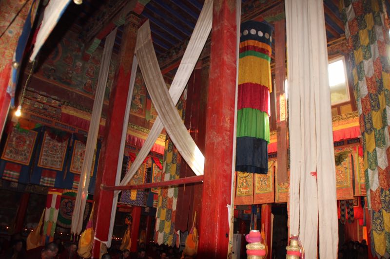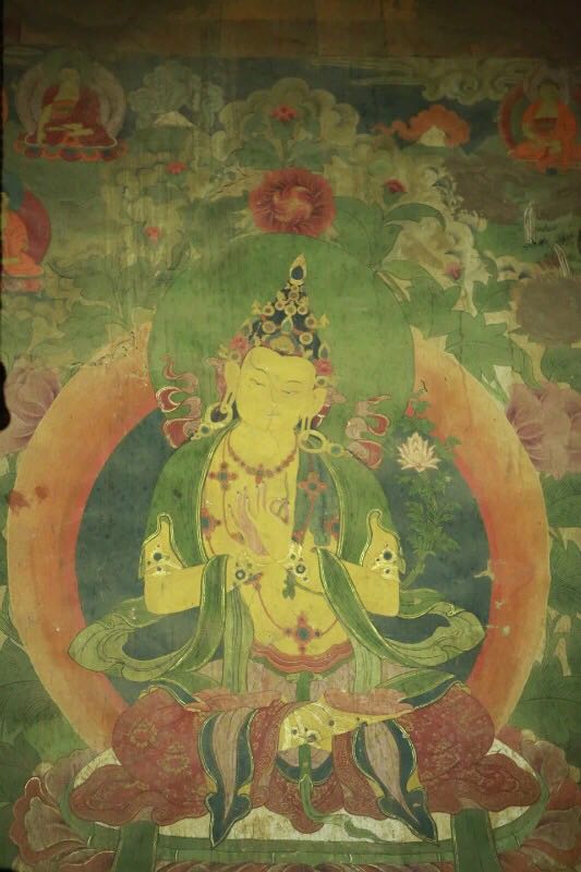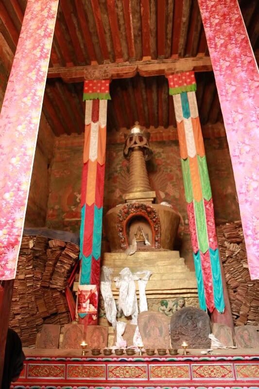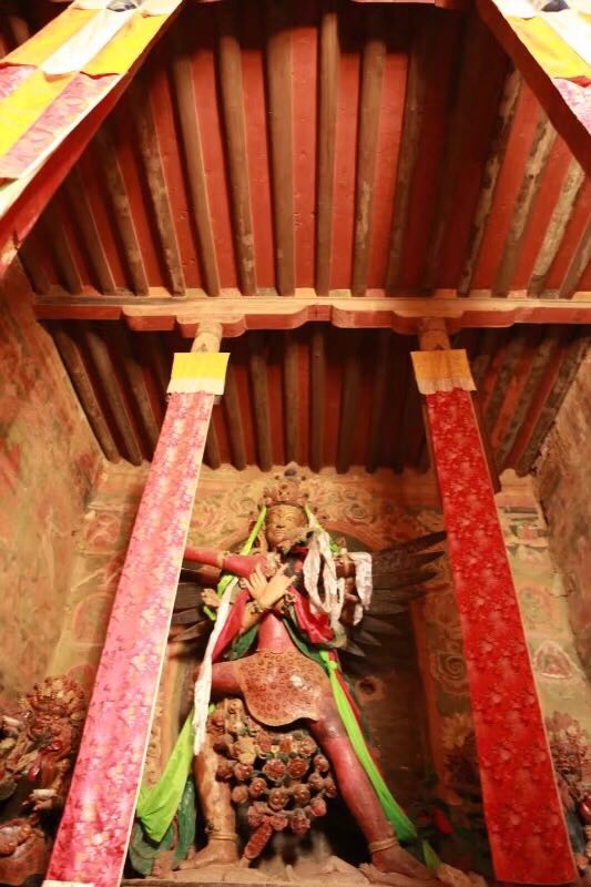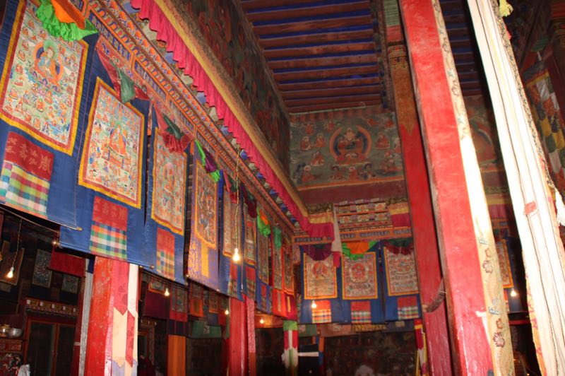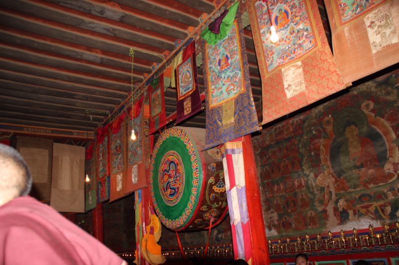大经堂四面的土墙上是由上品纯净的伏藏黄金和各种珍宝绘制的千手佛、八大佛子单身,嘉通卡法身金刚大持,莲师八相,王臣二十五位以及《愿望天成》都布局齐全,大经堂有着******的加持力。
