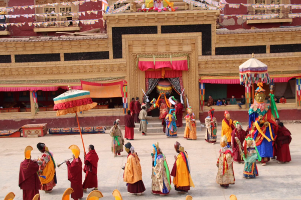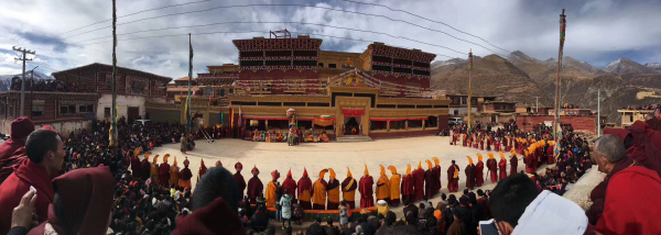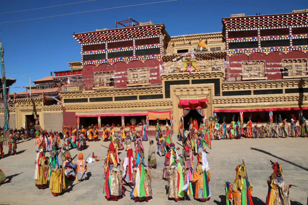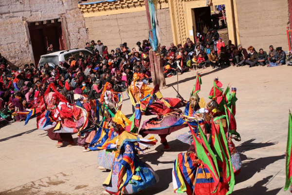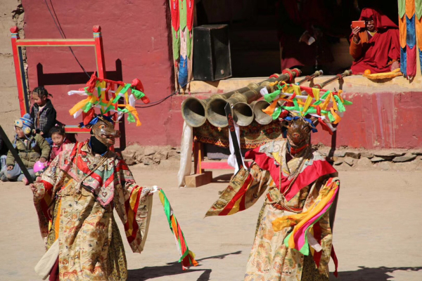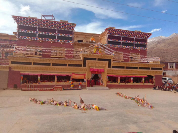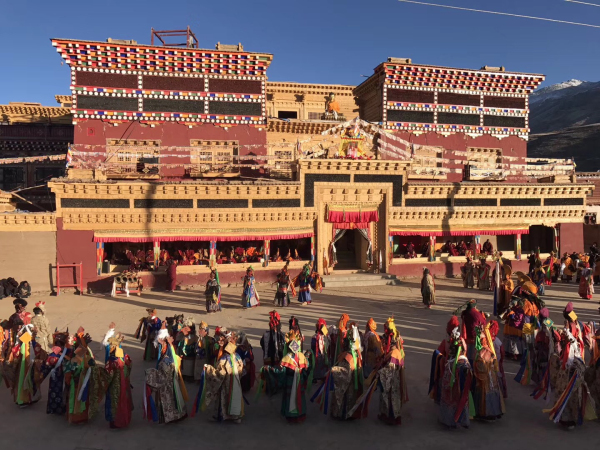 康藏尼扎打莫寺冬季法会,依照尼扎伏藏传承跳金刚舞。愿见闻得益!金刚舞要配合观想和禅修进行,但即使跳时观想、禅修不够好,也都可以同时累积六度波罗蜜功德。不管金刚舞修持的是哪位本尊或护法,都包含「息增怀诛」的四种事业在内,跳的时候可为自己、也为他人累积功德。金刚舞不只是身体的动作,它必须要在神圣的法会上演出,同时禅修本尊法门的生起次第与咒语的念颂。因此,当行者演出金刚舞,他可以藉由自身的修持与参加法会的加持,而获得本尊加持,并在来生得以到达本尊的境界,清净三门染污。对观者而言,透过观看金刚舞修持,可逐渐去除修行上的逆缘、累积顺缘,渐次成佛。藉由观看金刚舞,我们能经由服装与法器认识本尊。因此我们与本尊就有一个业力的关系,这能够帮助行者快速在此生完成特定法的修持;或者即使本身并非行者但此生非常精进的众生,也可以藉由观看某一位本尊的金刚舞,而种下来生亲见本尊的幸运种子。